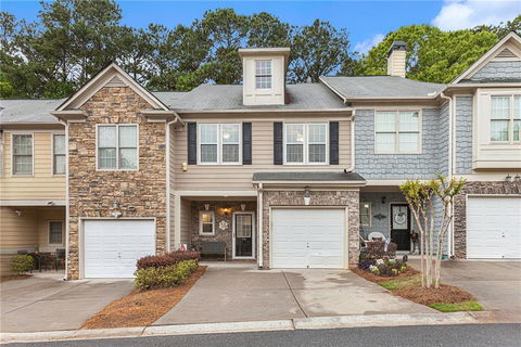 ABSOLUTELY ADORABLE town-home minutes from 575 & I-75, Woodstock and Kennesaw State University! This immaculately maintained 3BR/2.5 BA home features an open floor-plan with kitchen overlooking dining area and family room. Upgraded with beautiful granite counter tops in kitchen and bathrooms and easy to maintain laminate flooring leading into kitchen area. Enjoy your morning coffee or a spring grill-out with friends on your private back patio or cozy up to your beautiful stone fireplace on chilly winter nights! Head upstairs to the primary bedroom which features vaulted ceiling with ceiling fan, large walk-in closet, and ensuite bathroom updated with beautiful tiled shower and granite counter tops on vanity. Both secondary bedrooms are good size with ceiling fans in each room. Large laundry room is located upstairs for easy access. Make your appointment now to see this beautiful town-home as it wont last!