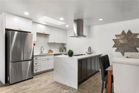 Discover this beautifully renovated 3-bedroom, 2-bathroom single-story townhome in Aliso Viejo, boasting a spacious, open-concept floor plan designed for modern living. The stunning new kitchen features quartz waterfall countertops, stylish two-tone cabinets, an island-mounted range hood with tempered glass and LED lighting, and a skylight that fills the space with natural light. The home offers a blend of elegant tile and luxury vinyl plank flooring throughout, complemented by retextured ceilings, crown molding, ceiling fans, and recessed lighting. Energy-efficient upgrades include new vinyl windows and sliding door, a smart thermostat, a brand-new HVAC system, and a new water heater. The remodeled bathrooms showcase quartz countertop vanities, large-format tile flooring, decorative tile shower floors, and frameless glass doors. Step outside to enjoy a private, enclosed patio perfect for relaxing or entertaining. Community amenities include two sparkling pools, a community center, and a nearby park with tennis courts. Conveniently located near shopping, dining, and entertainment options, this home is just 7.3 miles from the stunning shores of Laguna Beach with easy access to major freeways. Don’t miss the opportunity to own this exceptional townhome.