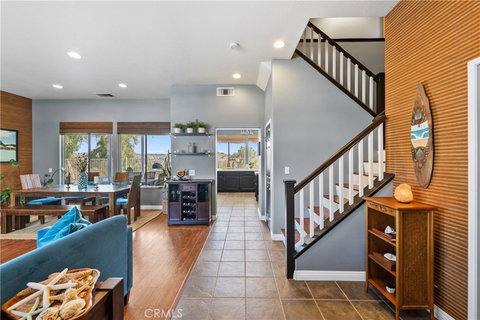 Views of city lights and hills enchant you from both levels of this spacious home! As you enter you immediately feel the island vibe of this tropical themed home. A cozy fireplace graces the living room, which is flooded with natural light from both sides of the home. The kitchen features stainless steel appliances and receives bright light through its many windows. Grass wallpaper accents many walls and cabinets throughout, further enhancing the island feel of this home. As you wander upstairs you immediately see a small nook-perfect for a small desk. All three bedrooms are on the upper level, including a spacious laundry room, allowing convenient access. The large primary suite includes extra closet storage space built into the main room as well as two closets inside the bathroom area. You can indulge in relaxation in your large soaking tub in the primary suite as well. Your outdoor areas will impress your friends and family with an outdoor dining area on the patio downstairs as well as a balcony with a bar and seating area upstairs on the second level. This home has an extra large backyard unlike most others in the community. Located close to shopping and dining at the nearby Aliso Viejo Town Center. Just a short walk to Wood Canyon Elementary School, and also very close to Aliso Niguel High School. Nearby close access to the 5, 73 and 133 highways. Laguna Beach, Dana Point Harbor, and other popular attractions are just a short drive away too. Come see this one before it's gone!