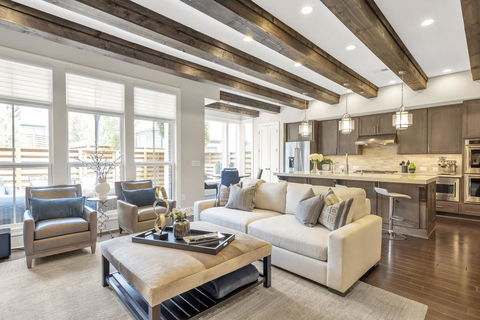 Luxury at its absolute finest! Welcome to the largest townhome with an elevator and countless upgrades in this sought-after gated subdivision. Gorgeous hardwood floors lead you into a main-level living area sanctuary, boasting a fireside living room with built-in shelving beautiful wood beams on the ceiling, a dining area perfect for entertaining with built-in buffet, and a chef's kitchen ready to prepare a gourmet meal. The cafe nook in the kitchen area allows room for a breakfast table and large picture window overlooking the patio and greenspace, unique to the Yorktown floorplan. Upstairs, the bright hallway leads to a lounge area adjacent to the oversized owner's suite with customized walk-in closets, a huge shower and double vanities. The ample sized secondary bedrooms are each adorned with an accent wall and offer large closets and a shared hall bathroom. The 2nd level laundry room is super functional and convenient and there is no shortage of storage space throughout the home. The third level is ready for guests, entertaining, and your imagination! The 4th bedroom, currently used as a gym, offers a full bathroom and two large walk-in closets. The office space with amazing built-ins and balcony is bathed in natural light. Take the elevator back to the first floor and enjoy mornings and evenings lounging on the private back patio, with fenced-in green space. Freshly painted exterior. Enjoy the low maintenance of a townhome with 4,100 sq ft of luxury living space. Walk to the community pool, cabana, bocce ball area, open green space and fire pit. Minutes to 400, Avalon, Big Creek Greenway, and downtown Alpharetta. Less than a mile to Top Golf and walking distance to Ameris Bank Amphitheater and Fetch Dog Park. Surrounded by shopping, restaurants, and great schools, this home and neighborhood truly has it all!