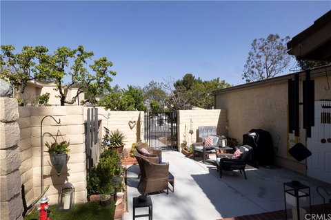 Situated within walking distance of local shopping, restaurants, and schools, this end-unit single level condo highlights pride of ownership. Prior to entry, an open courtyard welcomes all your guests with ample sunshine and greenery to brighten up your summer BBQ's. Upon entry, natural light floods the vaulted ceiling and open living room complete with a gas starter fireplace for a cozy evening. Right around the corner, step into the granite counter kitchen, adjacent eating area, and breakfast bar. Retreat to your generously sized master suite with a spacious granite counter sink, shower, and over sized his-and-her closet. Enjoy a cup of morning coffee on the master patio just outside the master bedroom overlooking the trees and hills. A second well-situated bedroom sits off the living room along with a second full bath just across the hall to round out the layout of this home. With the attached two car garage including a full wall of built-in cabinet storage and washer dryer hook ups as well as amenities including two pools and two Jacuzzi's in the community, this condo offers a rare opportunity in North Orange County.
