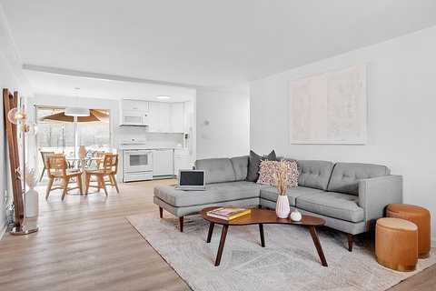 Beautifully remodeled condominium in a tranquil setting! Gorgeous home boasts a fantastic living space comprised of 2 spacious bedrooms, 1 full bath, eat-in kitchen with all new everything: shaker cabinetry, quartz counters, appliances, backsplash, lighting, fixtures, hardware & walk-in pantry/storage. Sun-drenched oversized open-concept living room, ideal for hosting and entertaining all your family & guests. Upgrades include newly painted interior, wood-look luxury vinyl floors thru-out, new lighting, bath updated with all new modern vanity, toilet, lighting, fixtures & stunning tile shower walls/floors. Unit is all on main floor - no stairs! Slider with direct walk-out to your own private & serene covered outdoor space, overlooking the grounds and tennis courts/swimming pool area. Features in-building laundry, storage, & parking for 2 cars. Close proximity to shopping, highway, restaurants, public transport/commuter rail, among many other amenities. Single level living at its best!