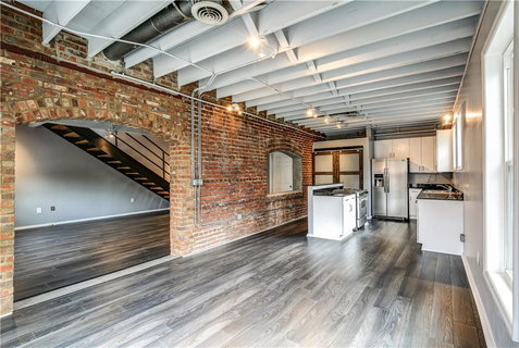 Stunning! 2-story, corner unit loft in the heart of Castleberry Hill. Beautiful flooring, exposed brick and loads of natural light pouring through new windows. Downstairs: Large living room, half bath, and kitchen with great counter and cabinet space, SS appliances, pantry and dining area. Upstairs: second large living area, 2 big bedrooms, elegant bathroom with marble, double-vanities and tiled, walk-in shower. 2 parking spots, 2 storage areas in secure garage. Views of neighborhood and stadium from shared rooftop. Walk to restaurants, shops, events and more!