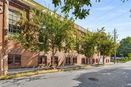 The building includes a rooftop deck with skyline views and gated parking for residents. Many units feature exposed brick walls, polished concrete floors, and high ceilings, creating an inviting atmosphere. Some units may include floor-to-ceiling windows, adding to the light-filled spaces.