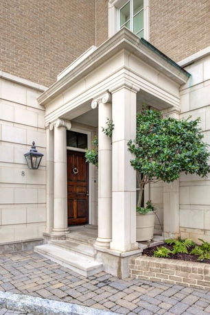 Residents enjoy elegant architectural features. The design combines classic brick and limestone exteriors with modern touches. Cobblestone streets and gas lanterns add charm. Large windows bring in ample natural light, showcasing the sophisticated interior.