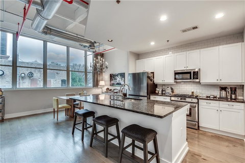 Live the vibrant urban dream in this stunning 2 bedroom, 2 full bath loft in the heart of Midtown! This stylish space boasts soaring ceilings, wall of windows allowing an abundance of natural light, gorgeous wide plank wood floors throughout, and ideal entertaining space. Enjoy the modern comforts of a sleek white chef's kitchen housing stainless appliances, generous island with sink and cabinetry, granite countertops, recessed lighting, and tile backsplash. NEW refrigerator and dishwasher (Fall 2023) and HVAC (Fall 2024), newer hot water heater, and recent professional air duct cleaning!!! Relax and recharge in the beautifully renovated primary bath that showcases an oversized tiled shower with seamless glass, dual showerheads, double vanity and open linen storage with floating shelves. The serene primary bedroom has two custom closets, one with overhead storage with convenient ladder attached. Enter the secondary bedroom through a galvanized barn door with Westside Provisions transom window; the ensuite bath is updated with tiled tub/shower combo and white vanity - perfect for a guest or roommate. Lower than the average for the area, the HOA dues cover internet and all utilities - owners pay separately for power only! Beyond your doorstep, you'll find two assigned parking spots in a gated, covered garage, secure front entrance, and TWO deeded storage areas. With the iconic Fox Theater only steps away, convenience to Woodruff Arts Center and Ga Tech, and a quick walk to coffee shops and Marta, all of Atlanta is at your fingertips! With only 20 units, there are rarely units available for sale so don't miss out...the best of the city awaits!
