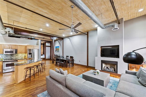 Inside the units, high ceilings range from 10 feet to 30 feet, creating a spacious feel. Many homes have striking exposed brick and hardwood floors. Modern kitchens feature stainless steel appliances and breakfast bars, catering to today's lifestyle. A rooftop area provides space for entertaining or relaxation, while a dog park adds to the community's appeal.