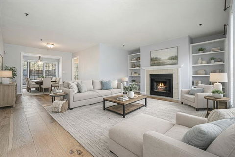 Refined, low-maintenance living in one of Smyrna’s most conveniently located gated communities. Perfectly positioned in the heart of the city, this end unit condo residence offers effortless access to premier shopping, dining, and entertainment, along with quick connections to Downtown Atlanta, The Battery Atlanta, and Truist Park—home of the Atlanta Braves. Whether commuting to the city or enjoying a night out, the location places the best of metro Atlanta just moments from your front door. Inside, the thoughtfully designed roommate-style floor plan delivers both comfort and privacy, making it ideal for homeowners, guests, or shared living. Rich six-inch luxury vinyl plank flooring in natural wood tones flows throughout the main living areas, creating warmth and continuity. The inviting family room is anchored by a gas fireplace and enhanced with custom built-in shelving, offering the perfect backdrop for both everyday living and relaxed entertaining. The gourmet kitchen is both stylish and functional, featuring all appliances and a sunny eat-in breakfast area. Just beyond, a separate dining space provides flexibility for more formal gatherings or quiet dinners at home. Both bedrooms are generously sized and thoughtfully positioned for privacy. The primary suite features a walk-in closet and a private ensuite bath, while the secondary bedroom also offers a walk-in closet and convenient access to the hall bath with tiled flooring. A private laundry area with washer and dryer included adds everyday convenience. As a desirable end unit, the home enjoys added privacy along with ample nearby parking. Step outside to a covered rear porch and a fully fenced, private patio—an inviting outdoor retreat perfect for morning coffee or evening relaxation. Residents of this gated community enjoy access to resort-style amenities, including swimming and tennis, creating a lifestyle that blends comfort, convenience, and recreation. This is an exceptional opportunity to own a beautifully appointed, move-in-ready residence in one of Smyrna’s most sought-after locations. Effortless living, prime convenience, and timeless comfort all come together here