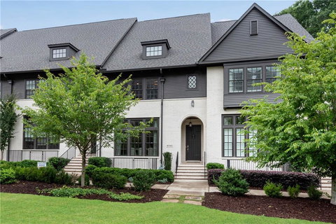 4-Story Townhome in Ashton Woods Homes coveted Aria West. Immaculately maintained by the original owner who handpicked one of the most desirable lots to build on with wooded views in the back and park/courtyard views in the front. Foyer greats you to 10' smooth ceilings and wide plank hardwood floors flowing across the main level. Formal dining views the quartz kitchen w/expansive island that could easily fit up to 9 barstools. The kitchen also offers two pantries, gas cooking, wine fridge and pendant lighting. The fireside great room is adorned with custom built-in cabinets and wood beamed ceilings. Relax on the deck with scenic wooded views. The hardwood floors continue on all staircases as well as into the 3rd level hallway and primary suite. The primary bath features an oversized vanity, garden tub, tile shower w/dual heads and a custom closet. Upstairs tile laundry w/built-in folding cabinets (front load washer/dryers included). Two secondary bedrooms share a tile bath w/double vanity. You will never want to leave the loft style 4th floor media room w/real thin bricked walls, hardwood flooring, custom trimmed TV wall w/built-ins and included 85" tv, full tile bath and upper balcony that will support a hot tub! Rare for a townhouse - HUGE walk-in attic storage area with window off 4th floor - could be potential to finish small office or finished storage room. Not your normal townhome terrace level with a living room and separate bedroom both with hardwood flooring. The bedroom has a large custom closet and the tile bath is upgraded with a stand up tile shower. Granite coated garage floor. SONOS system on main level, terrace level, primary suite and upstairs media room comes with ceiling speakers, soundbar, amp, subwoofer and 3 receivers. Custom drapes included. STUBBED WITH FUTURE ELEVATOR SHAFT. Swim community in an excellent location right off 400 next to Mercedes-Benz corporate offices. Over $80k in custom upgrades added by owner after builder completed home.