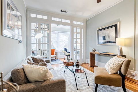 You will love the charm of this 1915 condo in Midtown’s Tyree, designed by famed Atlanta architect Haralson Bleckley. It was one of Atlanta’s earliest garden apartment buildings. This spacious (1100 square foot) top floor, one bedroom has charm galore: high ceilings, in-laid oak and heart pine floors, glass French Doors with side lights and transoms, heavy moldings, large windows, claw foot tub and original butler’s pantry. It has updated kitchen with new quartz counters and glass tile back splash. Amazing location in Midtown and walking distance to the beltline, and Ponce City Market. The home has a versatile floor plan with: Bright entry hall, sunroom or office, Large living/dining combination with in-laid floors, ceiling fan open to the sunroom/office, Large, updated kitchen with: white cabinets, new quartz counter tops, glass tile backsplash, newer appliances, original butler’s pantry, laundry closet with stacked washer and dryer, and a breakfast nook, Back deck space and shared courtyard for outdoor entertaining, Long gallery hallway with heart pine floors and great wall space for art, An updated travertine tiled bath with newer vanity and a claw foot tub/shower, Oversized bedroom with heart pine floors, two closets and a bonus space that can be a dressing room, sitting room, or home office. Taxes do not reflect Homestead Exemption.