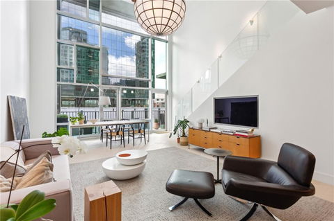 Stunning Midtown Home with bespoke architectural finishes throughout, unique to any other property. Italian honed limestone floors on entire first floor and second floor bathroom and closet. Custom frosted glass doors throughout home. Enclosed backlit stairway with stunning glass bannister, offering additional storage room below. Living Room with soaring 20 foot Ceilings, recessed in-wall tv niche, and one-of-a-kind pendant lighting First floor gallery wall with floating art shelf and spot lighting. Chef's Kitchen with custom Cabinetry, Emperador Marble Island, and high end appliances including integrated Sub Zero refrigerator, Dacor range and Undercounted Microwave and Bosch Dishwasher. Enclosed mezzanine bedroom with pocket doors providing total privacy and a glass railing that overlooks the living space below. Turn-key living experience with freshly painted walls and and a new Trane HVAC System. Resort style amenities including club room top club room, heath club and salt water pool with stunning Midtown views!
