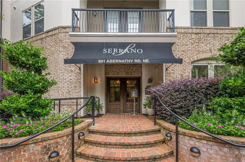 Welcome home to this beautiful RENOVATED condo in the Serrano community. This gorgeous unit ticks off all the boxes. Located in a private setting, this lovely home is conveniently located within walking distance to shopping, restaurants, MARTA and Mercedes Headquarters. When you walk into the foyer, you will immediately notice the freshly painted home and painted kitchen cabinets, the hardwood floors, stainless steel appliances, granite countertops, breakfast bar, open concept dining room with a new fan and the new carpet for both bedrooms. Don't miss out on the master suite with new countertop and sinks, new shower and refreshed separate soaking tub and a large custom walk-in closet. Don't miss seeing the spacious second bedroom with another custom closet. Another Bonus.... there is a NEW HVAC, and your HOA dues include the high speed 1Gbps internet. Pet owners...you will love the oversized patio that walks directly out to grassy areas for your pet. No rushing to an elevator to get to the lobby to run outside! Serrano also has amazing upscale amenities including a concierge, club and media room, pool, a state-of-art fitness room and sauna. Lastly don't miss out on the two deeded parking spaces in the secured gated parking garage that is located on the same level as your home.