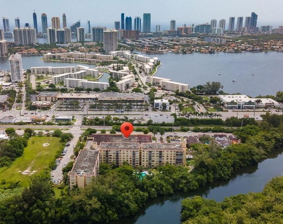 Aerial view of a cityscape with high-rise buildings, water bodies, and a marked location.View ListingMLS ID #A11343384