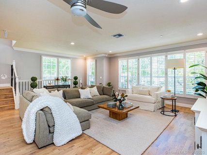 Beautifully kept home with a desirable southern exposure, ''end unit'' allows for light filled living areas. Recently installed new white modern kitchen cabinets and quartz counter-tops, custom baths, Scandinavian wood floors and plantation shutters throughout. A professionally landscaped backyard offers an extended travertine stone patio and ''summer kitchen''. Crown molding, central vacuum, surround sound system, and garage with custom cabinets and epoxy floor. A luxurious master suite offers walk-in closet, and the master bath is complete with a Jacuzzi tub, separate shower and double vanities. Energy saving features include impact windows and doors, Rinnai tankless gas hot water system, 2 RHEEM AC high efficiency units, Bosch dishwasher, and LG High Efficiency washer and dryer.