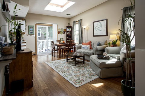 Private entrance leads you to an enormous second floor 1 bedroom home situated on private way in the heart of City Point just steps from East Broadway, local parks, and beaches. The home has gorgeous hardwood floors throughout, updated stainless appliances, tall ceilings, an open floor plan with clearly defined living and dining spaces. Corner unit with 5 windows, large skylight, and double sliding glass door that ushers you onto a large private deck. Additional amenities include central air, in-unit laundry, deep storage closets, and professional management. A truly wonderful home.