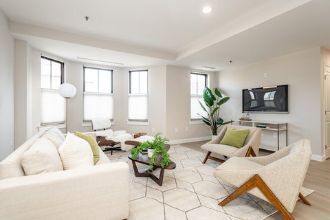 Rarely available condominium unit at The Columbia on St. George Street, across from Franklin Square Park! New construction in 2000, this spacious two bedroom residence is newly renovated and features beautiful wide plank hardwood floors, an open floorplan living and dining space with a bay window and private deck and a chef's kitchen with marble vein quartz counters and backsplash, shaker style cabinets and Jenn-Air professional appliances. The bathroom is a stunner with marble basketweave flooring and fixtures by Kohler and Grohe. The master bedroom is huge and has a double closet with custom closet systems. An ample second bedroom, separate laundry room with new full sized side by side washer/dryer and central air round out this beautiful home.