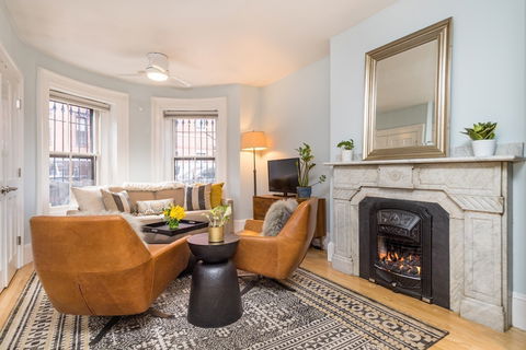 Renovated street entrance one bedroom located on a beautiful tree-lined street in the heart of South End: Bow- front living room with original marble mantel (gas fireplace insert) and designated dining area. The state-of-art kitchen with stainless appliances & granite counters offers an ideal floor plan with breakfast bar and abundance of cabinets/counter space. Bow-back master bedroom has a sun-filled en-suite marble bath and French door that leads to a 6’ x 14’ deck. Other features include ash hardwood floors, central a/c, ceiling fans, custom closets, washer/dryer, pre-wired audio and Hunter Douglas blinds.