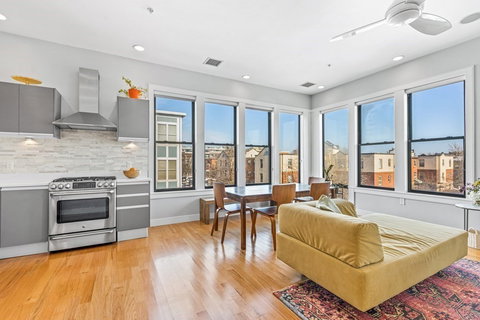 Bright and Airy Corner 2 Bed/2Bath Condo with Deeded Garage Parking! Spacious and flexible open concept living, featuring dramatic windows flanking 2 sides that highlights the lofty ceiling height and the gorgeous natural tone hardwood flooring throughout. Contemporary kitchen design features Stainless Steel appliances, white quartz countertops, coveted Gas cooking, with room to add an island. Master suite can easily accommodate a king-sized bed, hosting a walk-in closet and is served by a modern ensuite bath offering double vanity and tiled glass surround shower. Second bedroom is well proportioned to accommodate a bed plus office desks with 2 closets. Bluetooth built-in ceiling speakers, In-Unit Laundry, Central Heat and A/C, Deeded Garage Space with extra storage closet; Well Managed condo association with low HOA; All located within a short walk to Broadway T, amidst the booming development of Broadway Village. An excellent value, emphasizing function with a contemporary flair!