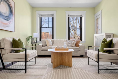 Perched atop a handsome brick building on Commonwealth's storied carriage road, this airy top-floor condo blends classic Brighton character with thoughtful modern updates. The eat-in kitchen is a home cook's delight: new stainless-steel appliances including a 4-burner gas convection range, French door refrigerator, and stainless-steel lined dishwasher, all within a generous sun-drenched eat-in dining space. The welcoming living room, with oversized windows framing treetop views, flows effortlessly into a dedicated dining space, ideal for entertaining or a quiet dinner at home. Flanking the living room are two generous bedrooms filled with natural light from two double pained windows, refinished hardwood floors, and ceiling fans making the spaces perfect for home office/guest room split or a peaceful primary retreat. Step onto your private iron-railed balcony and take in the sweeping neighborhood views. Prime location near transit and green space.