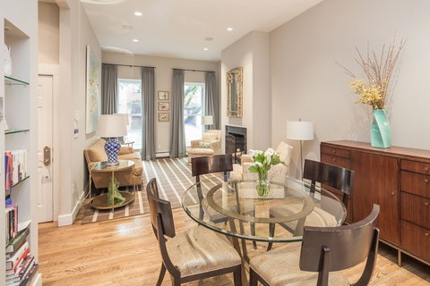 This parlor triplex three bedroom home is in the coveted Eight Streets neighborhood - the location your clients dream about! Right across the street from lovely Ringgold Park. Grab a coffee at the Wholy Grain or stroll to dinner at Coppa after you walk home from the office. Commuter's dream with easy access to Pike, 93 and airport. Enter the home to bright and open living, dining, kitchen with hardwood floors, Sub Zero fridge and Thermador 5-burner stove. Relax by the wood burning fireplace while people watching from your huge parlor level windows. High ceilings equipped with surround sound, breakfast bar and deck off kitchen complete the parlor level. Master bedroom with en suite bath and his and her closets looks out over huge landscaped garden. Good sized second bedroom with custom built ins and nice light. Bonus third bedroom with en suite bath leads to a cozy media room with surround sound, wet bar and direct access to the private city yard. Rental garage parking available.