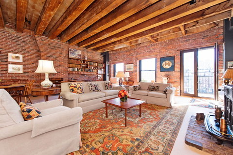 Fabulous opportunity to live at prestigious Lewis Wharf on Boston's Waterfront. This charming, oversized, rarely available south-facing home boasts high beamed ceilings, original brick walls, a large private balcony, and wonderful water and city views. There are two bedrooms, two full baths, and a large den with custom floor to ceiling closets and bookshelves. The open kitchen features gorgeous handcrafted cabinetry with a separate desk area. The expansive living/dining room can accommodate a large dining room table, a separate desk area, and has a wood stove which can be converted into a wood burning fireplace. Both baths are tiled, one with a walk in shower and the other with a bath tub. There is a common laundry in the building but the new owner has the ability to add a washer/dryer in the unit. Lewis Wharf is an elevator building with 24 hour concierge, beautiful gardens, and a seasonal swimming pool. Sorry no dogs allowed, just cats.