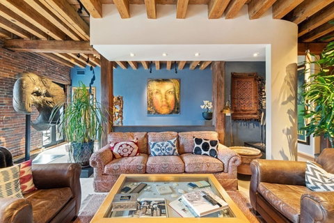Stunning south-facing duplex at prestigious Lewis Wharf. Designer brick and beam home featuring a spacious living/dining room with a wood burning fireplace and french glass doors leading to a private deck with sweeping harbor and skyline views. Galley kitchen. Large second bedroom with ensuite bath. Open staircase leading to an amazing master suite with abundant built-ins and a closet/dressing room which will take your breath away. Spa-like master bath with double sinks and large custom tile shower. Private laundry room with ample storage. Large office/den area with custom built-ins and second deck. Additional features include state-of-the-art sound and lighting systems. Lewis Wharf is an elevator building with 24 hour concierge, seasonal swimming pool, and lovely south side gardens. Walking distance to the North End, Faneuil Hall, Financial District, and the Seaport. Easy access to all major routes in and out of the city.