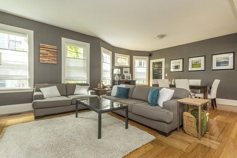 Contemporary and charming first floor residence with updated kitchen + baths. This beautiful home w/ high ceilings has been well maintained and offers a great layout w/ large chef's kitchen opening to living and dining for a true entertaining space. Fantastic central JP location w/ close proximity to Green Street T, and Centre Street restaurants & shops. Large bedrooms, A/C, shared yard, deeded parking and additional storage in basement round out this lovely home.