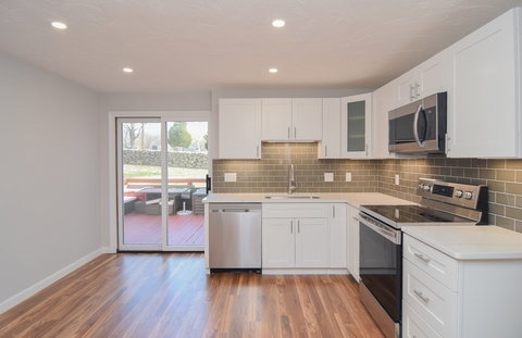 Completely renovated town house in highly sought after W.Roxbury for its low taxes & condo fees! Single family feel with all the amenities of condo living. Tasteful finishes through-out. Central AC, custom kitchen cabinets & vanities with soft close doors/drawers, quartz countertops, tiled backsplash has under cabinet lighting, all new Samsung stainless steal appliances w/ warranty, LED lit touchless faucet, garbage disposal, Italian tiled bathes, oversized living room, vaulted ceiling master bedroom has remote ceiling fan, updated 200 amp electric w/ dimmable recessed lighting, sliders to a lovely sunlit deck, and professionally painted interior with modern colors throughout. Generous closet space & full basement w/ great potential for bonus room or home office and off street, private parking just steps from your door. PRIME LOCATION-easy access to public transportation, shopping, Legacy Place, major routes & downtown Boston.