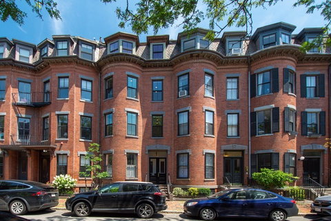 Nestled in the South End’s coveted Eight Streets, this stylish penthouse triplex is a rare find. Not only is it a stone’s throw from sought-after parks, restaurants, and coffee shops, but the brick townhouse has been upgraded to bring contemporary flair to the classic brownstone building. The full-floor master suite is complete with a spacious dressing room, walk-in closet, fireplace, and full bath with a glass shower and jacuzzi tub. The second level offers two airy bedrooms, each with full ensuite baths, an office with gorgeous built-ins, and a charming walk-out porch, the perfect spot to sip your morning coffee. Ascend to the third level to find the eat-in kitchen—a gathering spot on the sunny top floor that rewards the cook with the best views. The kitchen opens to a dining area with custom-built storage, a fireplaced living room, and a powder room. Looking for an elevated rooftop dining experience? A staircase floats up to a remodeled roof deck with sweeping skyline views.