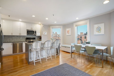 Open House Cancelled - accepted offer! Beautiful 3 bedroom 2 1/2 bath penthouse duplex with incredible outdoor space and TWO direct access parking spaces! This home has a wonderful floor plan with spacious, sun-filled rooms, high ceilings and large windows that showcase stunning skyline views. The main floor features a thoughtfully renovated kitchen open to a large family room/dining area with a walk out deck. In the formal living room there is a lovely fireplace and another inviting terrace. The charming 3rd bedroom also has access to this southern facing deck. Upstairs there are two more bedrooms including a master suite with an en suite bath, custom closets and access to another private deck with sliding doors. The second floor also has a full size laundry room. Part of a 100% owner occupied building, this home has incredible closet space throughout and additional deeded storage in the basement. Located on coveted Marlborough Street steps to the T, shopping and restaurants.
