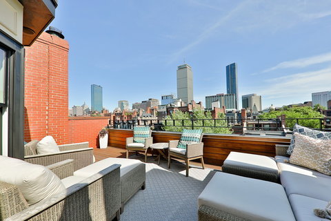 This Penthouse has a walk-out terrace with breathtaking views of the Back Bay skyline! This rarely available 3 bedroom, 2 bath penthouse duplex on the sunny side of Marlborough was completely renovated in 2014. This sleek and sophisticated home has a fantastic floor plan, high ceilings, large windows, and gleaming hardwood floors throughout. The designer kitchen is stunning with custom cabinetry, white Carrara marble countertops, Wolf induction cooktop, range,microwave, and a Sub-Zero refrigerator. The marble island opens onto the living/dining area, with a fireplace surrounded by walnut built-ins and four windows overlooking Marlborough Street. Two of the three bedrooms, a full bath and in-unit laundry are also located on the main level. The private second floor is all master suite, with a huge bedroom, walk-in closet and en suite bath with double vanity and a gorgeous glass and marble shower. A separate hallway takes you to the expansive walk-out terrace. One tandem parking space.