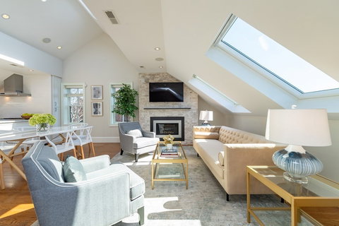 Renovated corner exposure 2 bed/2 bath penthouse duplex with south facing 6’ x 15’ deck: This sun-filled condo offers a hybrid of contemporary and classic charm with 13’ vaulted ceilings in the living/dining room, 7 sky-lights, gas fireplace and designer Thermador kitchen with Carrara counters. The large master bedroom features 14’ of closet space and en-suite bathroom with window, double sink vanity and oversized shower. Distinguishing features include large guest bedroom with walk-in closet, walnut stained hardwood floors, custom closets, Hunter Douglas Blinds, a/c, pre-wired for Total Home Automation, washer/dryer and designer baths. (FLOOR PLAN ATTACHED)