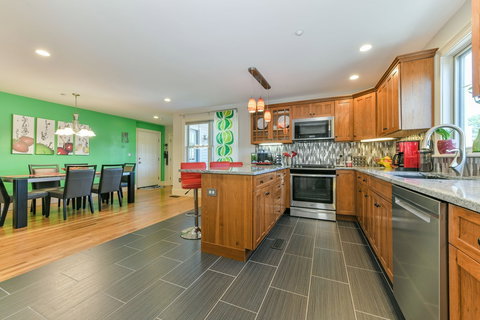 Featured in the Boston Globe Magazine, open Sun 9/16 130-3pm! Colorful, spacious and young...townhouse style condo across from the Bellevue commuter train stop. High walkability score...Enjoy local shops and restaurants in both W. Roxbury on Centre St. or in Roslindale Square. Recently remodeled, high end-kitchen, with dark oak-grain shaker cabinetry, under cabinet lighting, metallic backsplash, and stunning granite counters; gorgeous ceramic tile floor, recessed lighting, and stainless steel appliances. A large breakfast island separates the kitchen and dining space offering an open feeling with great natural light. Lovely, private back-porch. Living room w/crown molding, custom built-ins and gas fireplace. Tons of closet space. Laundry in unit. Central Air. Bedroom spaces have newer, high-end, wall to wall carpeting. Master bed with 2 closets, including walk-in and fully-tiled master bath with jet-tub. Remodeled 2nd full-bath plus 1 half bath. Deeded off street parking. Pet friendly!