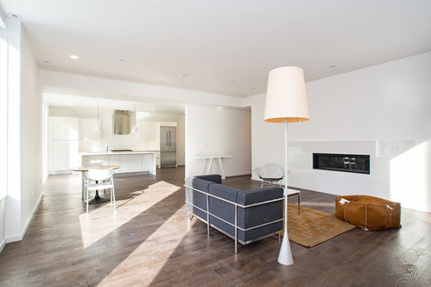 Ultra contemporary spacious duplex with large open style living room and kitchen. Soaring 10 Ft ceilings and extremely large windows. Gas fireplace with stone surround. Kitchen features custom Italian cabinetry and white Silestone countertops. Top of the line Thermador appliances. Large kitchen island with extra storage. Prevelco hardwood flooring throughout. Powder room on entertaining level. Entrance foyer with built in armoire storage. Second floor features two bedrooms and two full bathrooms. Master suite has sunny Southern exposures and beautiful European style ensuite master bathroom with tiled walk-in shower. High velocity heat and AC with two zones. Exclusive use of private roof deck with great city views. One full garage parking space with room for additional storage.