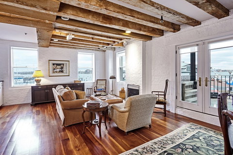 Waterfront property. Sought-After "Nose" residence at Commercial Wharf with 200 degrees of unobstructed harbor and city views. Ultra large open living/dining area with glass french doors leading to 230+ sq ft private deck overlooking the Boston Harbor. This residence features 2 Bedrooms with an additional study, 2 full baths, and 2 fireplaces. The sous chef's kitchen is complete with a gas Haier range and SubZero refrigerator. Entertaining bar with beverage SubZero , 2 wine refrigerators, and ice machine. Custom cabinetry and built-ins. Brick and Beam. 15 windows througout this waterfront property. Centrally located in the thriving waterfront neighborhood, close to the North End and Financial District and convenient to Interstates 90 and 93. 2 parking spaces available. Also, unit includes one storage bin.
