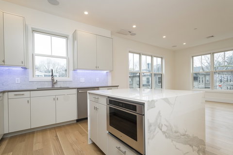 If you want beautiful contemporary living spaces w/ soaring ceilings, private roof deck w/ outdoor kitchen, 2 car garage parking + overflowing natural light...look no further! This three bedroom/two full bath penthouse residence at 65 Green combines all of this with efficient hydro-air heating & cooling, tankless on demand water, in-unit laundry, quarter sawn oak hardwood flooring throughout and surround sound speakers in every room. The gourmet chef's kitchen is outfitted with custom built maple cabinetry, Neolith countertop, professional appliances including Wolf stove, Jenn Air refrigerator, dishwasher and automatic microwave drawer. The master suite w/ walk-in closet offers a Carrara marble shower w/ spa-like rainhead fixtures, frameless glass door, penny round tile flooring and dual vanity w/ Grohe faucets. This professionally managed new construction building is tucked nicely between the renowned restaurants/shops on Centre Street and Green Street T.