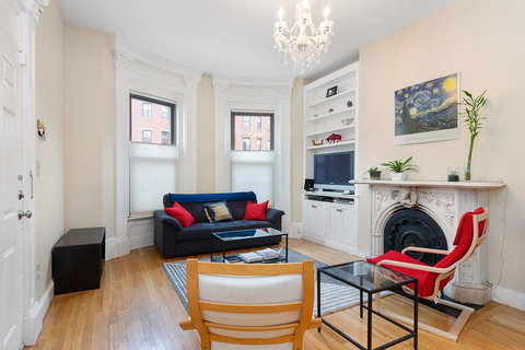 This Parlor level classic South End Brownstone has beautiful turn of the century details including a fireplace and fantastic modern updates. Newer Kitchen with stainless appliances, granite counters and beautiful glass back splash, newer windows and french doors, hardwood flooring and high ceilings. There's a private deck overlooking the community gardens. It's like having an additional living room, great for entertaining. Two equal sized bedrooms each with access to the deck make a great option for roommates. All marble bath, washer and dryer and hot water tank are new as of 2017. Central Heating & A/C new in 2015. The South End continues to be one of the most sought after neighborhoods in Boston, offering the best restaurants, cafés and boutiques, a vibrant arts and cultural scene, and numerous beautiful green spaces.