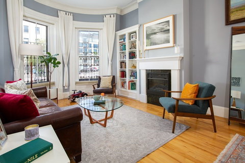 Near some of the best local spots, this extremely open and airy condo is spectacular w/ its expansive double parlor - so unique it can accommodate 3 seating areas, creating a dramatic entry to this condo! High ceilings and wonderful sunlight complemented by views of the gorgeous & historic Piano Factory across the way at the front, this condo's built-ins, fireplace, and warm hardwood flooring are inviting all while the rear of the room offers views of your private patio greenery. A large eat-in kitchen w/ 3 windows is perfect for casual dining and features a Viking fridge, abundant cabinet storage and direct access to the sensational patio. The enclosed patio is sunlit much of the day, has lovely flower beds, pavers and 2 mature trees. A serene master bedroom w/ 2 walk-in closets is bright and has an ensuite bath. The 2nd bdrm is nicely sized w/ 2 closets and is adjacent to the 2nd full bath. Powder room, amazing storage, pet friendly, professionally managed, newer heating & cooling.