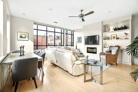Sun-filled & stunning corner one bedroom with garage parking on the fourth floor of a desirable elevator condo building designed by local architect Graham Gund. This gorgeous, well-thought out unit has oversized windows, all outfitted with electric shades, that allow for an abundance of natural light that fills up the living room/dining room/kitchen. The spacious living room features handsome built-ins, recessed lighting, an electric fireplace & plenty of space for a large dining room table. The lovely cook's kitchen has an abundance of cabinets/counter space, a breakfast bar, gas cooking & recessed lighting. The generously-sized master bedroom has a whole wall of closets that are built-out, floor-to-ceiling custom built-ins & double doors that open into a charming home office area. Recently gut-renovated bathroom feat. Bosch washer/dryer, lg linen closet, front-lighted LED vanity mirror, oversized glass-enclosed, tiled shower. Direct-access to 1 full garage parking space. A must see!