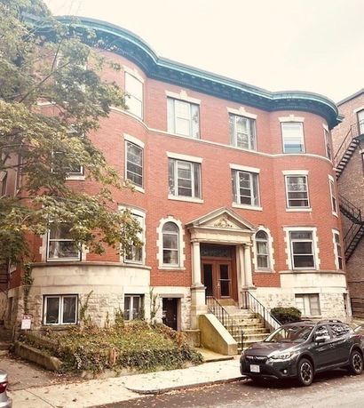 Front view of a three-story brick apartment building with multiple windows and a decorative entrance.MLS ID #73435635