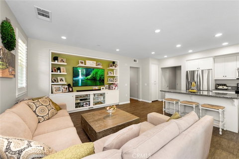 Don't miss out on the opportunity to live/work in the beautiful, planned community of La Floresta. This Spanish Style 3 bed/3 bath condominium includes guest living quarters with separate entrance on the main floor. With approx 1898 sq ft of living space, this home is one of the largest homes available with direct access from its 2-car attached garage. As an added bonus, the garage has a good size storage room. Some of the desired amenities include: white thermofoil shaker cabinets with concealed hinges, granite kitchen counter tops, Whirlpool stainless steel appliances (dishwasher/microwave), white quartz primary bedroom's counter tops, barn doors in primary bedroom and guest living quarters (both with walk-in closets), wood like tile floors, built-in entertainment cabinet in living room, storage bench in dining area, plantation shutters throughout, designer ceiling fans, tank less water heater, nine-foot ceilings and many more desired amenities. The guest living quarters is equipped with a walk-in closet and a large work/kitchen room with a laundry closet which accommodates a stackable washer/dryer. A separate laundry closet is conveniently located upstairs. Association includes a pool, spa, playground, clubhouse and many more amenities. Conveniently close to Whole Foods, shops and restaurants, this beauty will not disappoint!