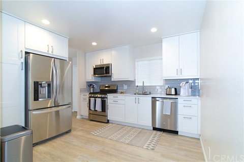 Welcome Home!! This Beautiful, FULLY remodeled 1,104 sq. ft. two-story condo in Brea with inside private laundry room and central A/C!!! Upon entry is an open kitchen, with breakfast nook/dinning area, large living room, inside laundry room with connections for full size washer and dryer, powder bathroom and a private back patio with no one behind. Upstairs has two oversized bedrooms and a full bathroom. No one above or below. Close to downtown Brea, the Brea Mall, shopping and excellent schools. Located in a very desirable area with everything close by. Remodel was done about one year ago, including all new stainless steel appliances. Gated community parking with two assigned spaces - one covered carport and one open space. Brea Community Center located behind parking area. Housing community located next door with cul-de-sac facing back of this home. HOA plans to update paint scheme of exterior and update landscaping within the year. Roof is covered by the HOA. PLEASE VIEW VIRTUAL TOUR AND ALL PICTURES.