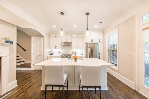 This is the one you've been waiting for!!! Rare 4 bed, 3.5 bath townhouse, that does NOT back up to your neighbor, in coveted Dresden Creek! Quiet location in the back of the community! BRAND NEW kitchen and primary bath! Redone hardwood floors on main! New carpet upstairs and down! Custom closet in the primary suite and in pantry! Open living room leads to double-sided gas fireplace, additional living room, and beautiful kitchen and dining room. Newly renovated white kitchen with quartz counters, breakfast bar, pendant lights, stainless appliances and matte black under counter sink matching gorgeous matte black hardware throughout. Grand primary suite with beautiful, just renovated primary bath. Dual vanities with quartz counters. Stand-alone tub. Separate shower with glass enclosure. Separate water closet. Huge closet with custom built ins! Two additional bedrooms, bath and laundry round out the upstairs complete with brand new carpet. Terrace level has a large 4th bedroom/guest suite/flex space with additional bathroom. Small backyard space off the terrace level perfect for gardening and/or pet area. Two car garage. All in a gated community, with a pool, 1.2 MILES from the Shops on Dresden!!!