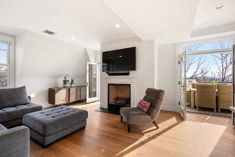 Exquisitely renovated two level condos on the peak of Corey Hill. Foyer with soaring ceilings, flooded with sunshine. Elegant staircase leads to an open concept floor plan. Spacious dining area and large sunny living room with wood burning fireplace and Chesney mantel. Kitchen features Thermador / Miele appliances, white / gray counters and Italian cabinets. Doors to private treetop 235sf deck perfect for dining, lounging and entertaining and features remote control awning for sun exposure control. Two bedrooms and hallway feature wide plank hickory floors. Tile / porcelain luxury bath. In-unit laundry, garage parking plus an additional outdoor parking space, and extra-large storage. Updates include door, hardware, floors, both bathrooms, kitchen, mantle, decking, washer / dryer, lighting, staircase, windows. C and B line 0.5 mile, Wholefoods 0.25 mile, Corey Hill Park across the street. Coolidge Corner, Washington Sq nearby. Move in and enjoy!