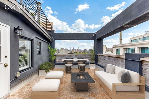 Upstairs, the oversized primary suite offers a pitched ceiling with a skylight that fills the space with natural light throughout the day. It also leads to the private and beautifully furnished terrace with direct views of the Midtown Manhattan skyline. The primary bedroom comfortably accommodates a king-sized bed along with space for a home office or sitting area, and features a large closet. The windowed en-suite bath is outfitted with Kohler fixtures and a glass-enclosed shower.