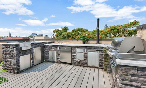 *Listing brokers are Julie Zelman and Nataly Rothschild of Engel and Volkers. Direct contact info is on the Engel and Volkers NYC website. Spectacular penthouse with Manhattan city skyline views, from your very own, enormous private rooftop deck and outdoor kitchen! And no, this is not a walk-up! Elevator opens directly into this extremely unique 2 bed/2 bath stunner. Entertaining is an outdoor lover's dream from the 1250 square foot private furnished deck, surrounded by panoramic Manhattan views, including the Empire State Building and Chrysler Building. The impressive outdoor kitchen is fully equipped with master grill, double-side burners, gourmet sink, kegerator, refrigerator, storage, garbage, ice bin with speed rack, electrical outlets and quartz countertops.Upon entering the apartment directly from the elevator, you will immediately notice the gorgeous, natural light flooding the entire beautiful home. The renovated kitchen with granite countertops, custom cabinetry and Bosch appliances opens directly to the bright and quiet living room. Down the hall, the private master bedroom features en-suite marble bath with massage panel and rainfall shower, and its own large terrace with city views. A second spacious bedroom and another full marble bath with jacuzzi completes this luxurious home. Every need is met in this exquisite space, including central air, radiant heated floors, washer/dryer, abundant closet and storage space and both dial controlled speakers and outdoor space in every single room. Extremely low common charges for so much private outdoor space, and tax abatement until 2025 makes this remarkable home one of the most rare and exciting Greenpoint offerings!* Same block as G Train* Deeded storage unit* No Condo Application.158 India Street is a boutique and private condominium with eight units. It is located across a beautiful row of red-brick brownstones on a quiet, tree-lined street surrounded by parks like Transmitter Park, Children's Playground, McGolrick Park, McCarren Park, and located less than half a block away from the G stop Greenpoint Avenue or a short walk to the East River Ferry.