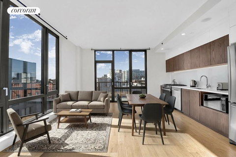 Welcome to Unit 8J, an exceptional, top-floor residence that offers a premium lifestyle in the heart of Brooklyn. This unit maximizes its space, featuring an open concept living and dining area that allows for flexible furniture arrangements and comfortable entertaining. Prepare meals in the marvelous chef's kitchen, complete with stainless steel Samsung appliances and ample cabinetry. Best of all, step out onto your private balcony, ideal for enjoying your morning coffee or unwinding in the evening, with sunset views over Brooklyn. The bedroom is generously sized, easily accommodating a king-size bed, space for a home office setup, and two large closets. Please note, furnished photos are of a similar unit (Apt. 7H), one floor below in the same line. This sun-filled home features elegant finishes throughout, including hardwood floors and floor-to-ceiling windows. Modern conveniences include 2 HVAC units, Bluetooth-enabled wireless speakers, and an in-unit stackable Bosch washer & dryer. This apartment includes deeded, covered parking in the building's private garage, as well as your own personal storage cage in the temperature-controlled cellar level. Enjoy significant savings with the building's 421-a Tax Abatement, which still has 7 years remaining and 2 years before escalation begins. The building offers a full suite of luxurious amenities for residents: A landscaped, furnished roof deck with sweeping Brooklyn views and a gas grill. A common lounge off the lobby with a large flat-screen TV, pool table, and kitchenette. A landscaped, furnished common courtyard. A basement gym. A virtual doorman/video intercom with electronic keyless access and a package room with cold storage. A dedicated dog run and free Wi-Fi in all common areas. 2100 Bedford is situated in the Northwest corner of the historic Flatbush neighborhood, mere blocks from the desirable Prospect Lefferts Garden border. This area is celebrated for its beautiful, brownstone-lined streets and is known as one of Brooklyn's "greenest blocks". Prospect Park is just a half mile away for outdoor exploration. Commuting is a breeze with four subway lines nearby: the B/Q at Parkside or Church Ave, and the 2/5 at Church Ave or Winthrop St., putting downtown Manhattan as few as 5 stops away. You're also just minutes away from the Brooklyn Zoo, the Botanical Gardens, and the magnificent Kings Theatre.