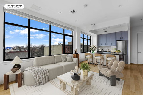 Residence 4B at 226 Clifton Place is a striking, light-filled home where design, and livability come together seamlessly. A dramatic wall of windows floods the space with natural light, while soaring ceilings enhance the sense of openness. The thoughtfully designed layout offers a serene flow for both everyday living and entertaining, anchored by a beautifully appointed open kitchen. Custom matte lacquer Italian cabinetry in soft pale gray and white is complemented by warm oak accents, Caesarstone countertops, and a Magnum Statuario slab backsplash. A Bertazzoni cooktop and range complete the space. Both bedrooms are generously proportioned, offering comfortable retreats with ample space for furnishings and excellent closet storage. The home also features spacious, well-designed bathrooms with wall-mounted walnut vanities and dramatic Calacatta marble feature walls. A Bosch washer and dryer in-unit adds everyday convenience. A storage unit in the basement is also included. Set within a full-service building, residents enjoy a thoughtful suite of amenities designed for modern living, including virtual doorman and attended package room with cold storage, as well as basement bike storage. Well-designed communal spaces bring warmth and character through concrete tiles and rich wood accents, found in both the inviting resident lounge and the oversized, sunlit fitness center. Outdoors, a shared ground-floor garden and a beautifully landscaped rooftop offer ideal settings for relaxation, entertaining, and taking in open-air greenery. Ideally located at the crossroads of Clinton Hill and Bedford-Stuyvesant, the home offers access to some of Brooklyn's best dining, cafés, and neighborhood charm, with the G train nearby for easy connectivity. Currently tenant-occupied through December 31, 2026, this residence presents a compelling opportunity for both investors seeking immediate income and end-users planning for a future move-in, located in one of Brooklyn's most dynamic and sought-after neighborhoods. Showing by appointment only.
