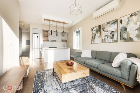 The sleek kitchen features matte lacquer cabinetry, quartz countertops with a waterfall edge, honeycomb tile backsplash, and stainless steel appliances. Both bedrooms offer custom closets, while the bathrooms are finished with hexagonal limestone tile and warm wood accents.
