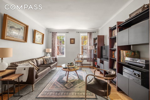 This oversized one-bedroom apartment on one of the loveliest blocks in Clinton Hill is larger than many two-bedroom units—with a flexible layout that converts easily into two bedrooms. The apartment features a formal entry or dining foyer with four closets, leading to a large living room with Western-facing windows overlooking lovely trees and the shared building gardens. The bedroom has three windows with dual exposures and easily fits a king-sized bed with room to spare—or can be divided into two bedrooms.